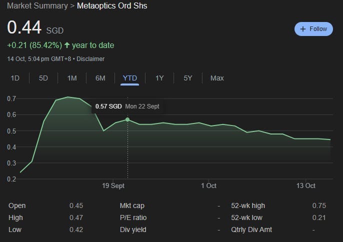 The successful IPO of MetaOptics in Sept 2025 already boosted the value of Metasurface’s stake. At S$0.44, Metaoptics has a MC of S$105M. Metasurface’s stake is (to overly simplify) valued at S$ 13.5m or roughly 1/3 of its own MC.