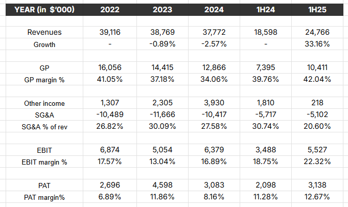 First-half FY25 sales rose 33% year over year to S$ 24.7m, and they had about S$17.8m of confirmed orders as of June 2025.