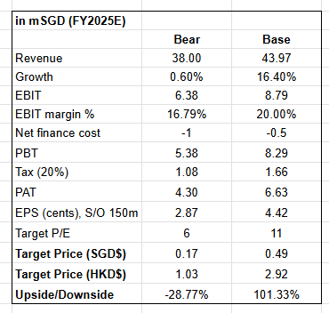 For the bear case, we assume FY25 revenue and EBIT margin are unchanged from FY24. For the base case, we assume 16.4% FY25 revenue growth, 20% ebit margin, and a re-rating to 11x P/E (a discount to peers trading around 16–20x+).