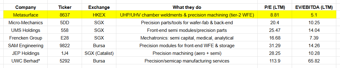 At ~HK$1.45–1.50, Metasurface trades at single-digit to low-double-digit LTM P/E and ~5× EV/EBITDA (incl. leases). That is a discount to Singapore/Malaysia precision peers that command mid-teens to low-20s multiples.