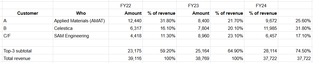 Sales are concentrated in the top three customers, which the company does not name (reported as Customers A, B and C/F). Based on the descriptors in the filings (business profile, scale, fiscal year, and geography), we believe customer A is Applied Materials, customer B is Celestica, and while customer C/F is SAM Engineering