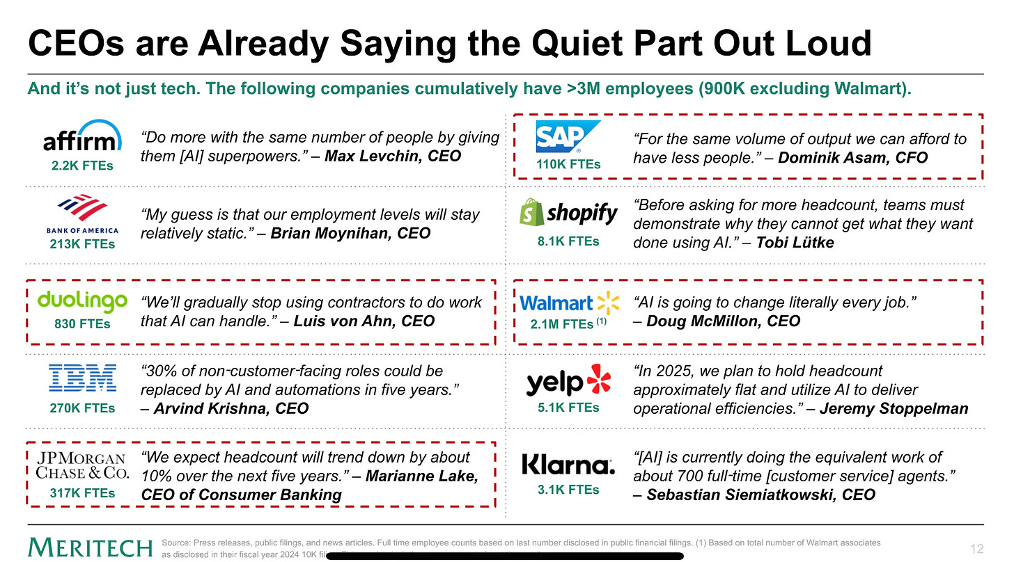 Whatever your views on the current utility of AI for work, CEOs are publicly committing to deploy AI. They will spend to roll it out, utilisation is a different question. The dynamic is explained in this funny satirical thread.