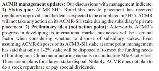 I’m told ACMR has been communicating its intention to sell small amount of ACM Shanghai to fund US operations.