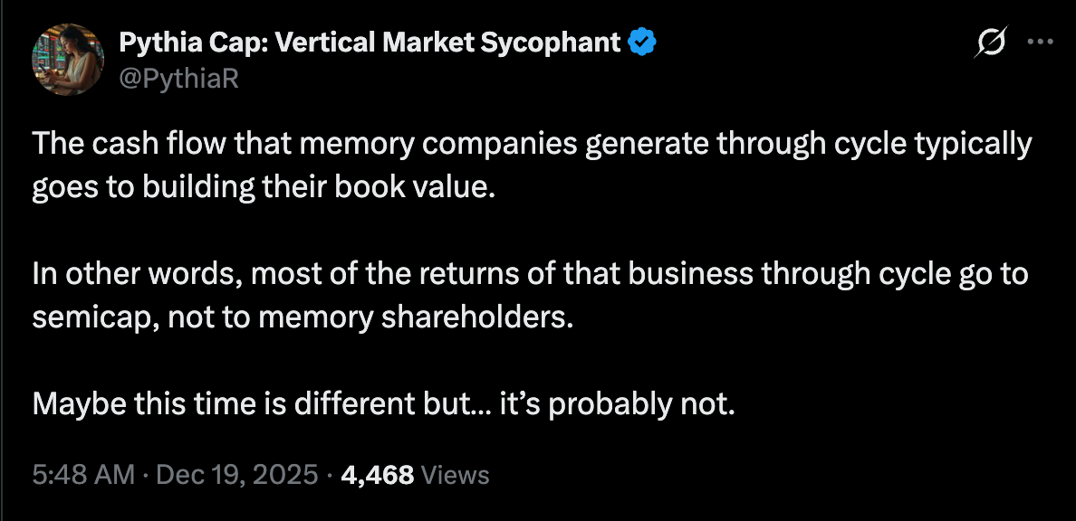 Memory semicap beneficiaries include ASML and AMAT. As a ballast for China FUD, one could consider adding ACMR to that list. The thesis is succinctly illustrated by this chart from Citrini: