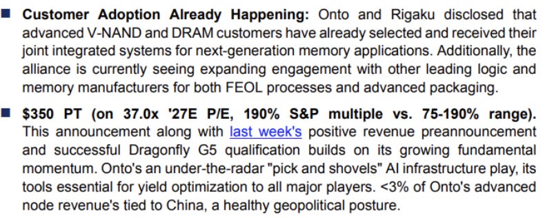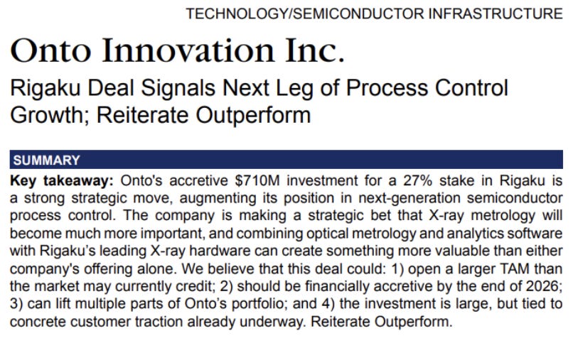 Rigaku limit up today as Onto takes 27% stake and announces that new jointly developed offering has already been selected by two key customers. (PR)