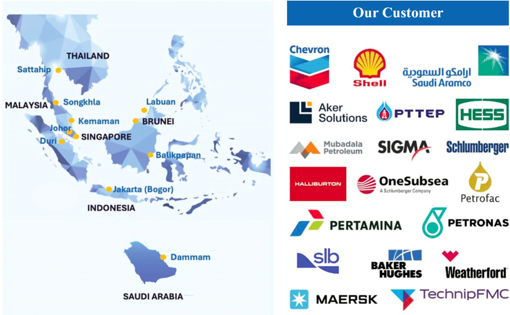 The company operates across SEA and in Saudi Arabia. It has successfully executed a localisation strategy that has led to a lucrative relationship with Saudi Aramco (67% of revs), but which is also being executed in Malaysia, Thailand, Indonesia, Brunei and potentially other jurisdictions like Pakistan.